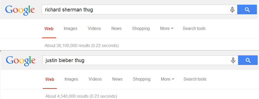 Racial and social engineering brainwashes people to think anything White is right and anything Black is bad. Thus why Justin Bieber isn’t considered a thug despite his bad behavior while Richard Sherman is called a thug